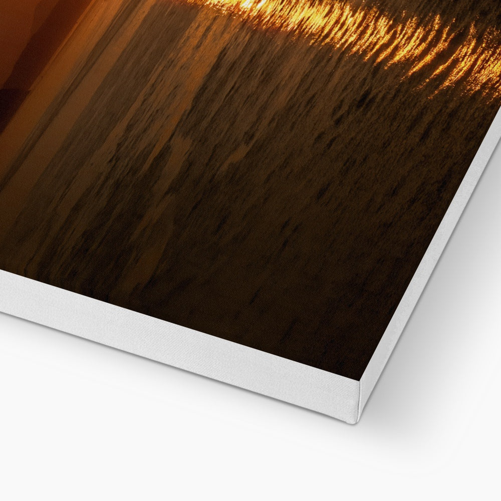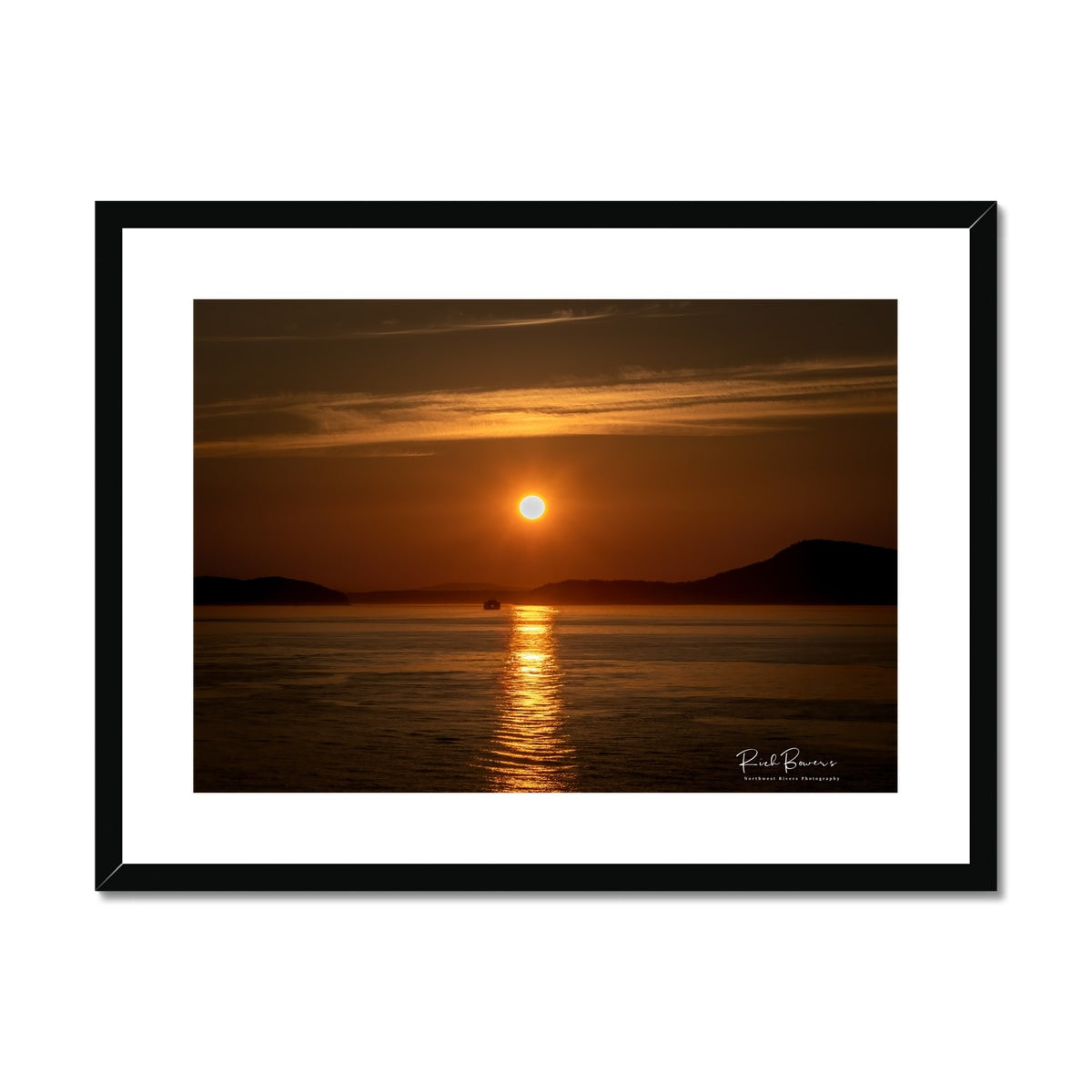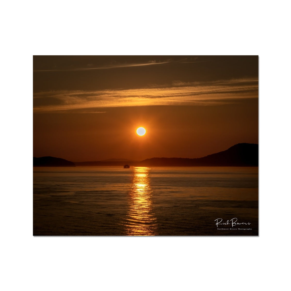 A boat returns home after a day on the Salish Sea, enveloped in wash of golden sunset.